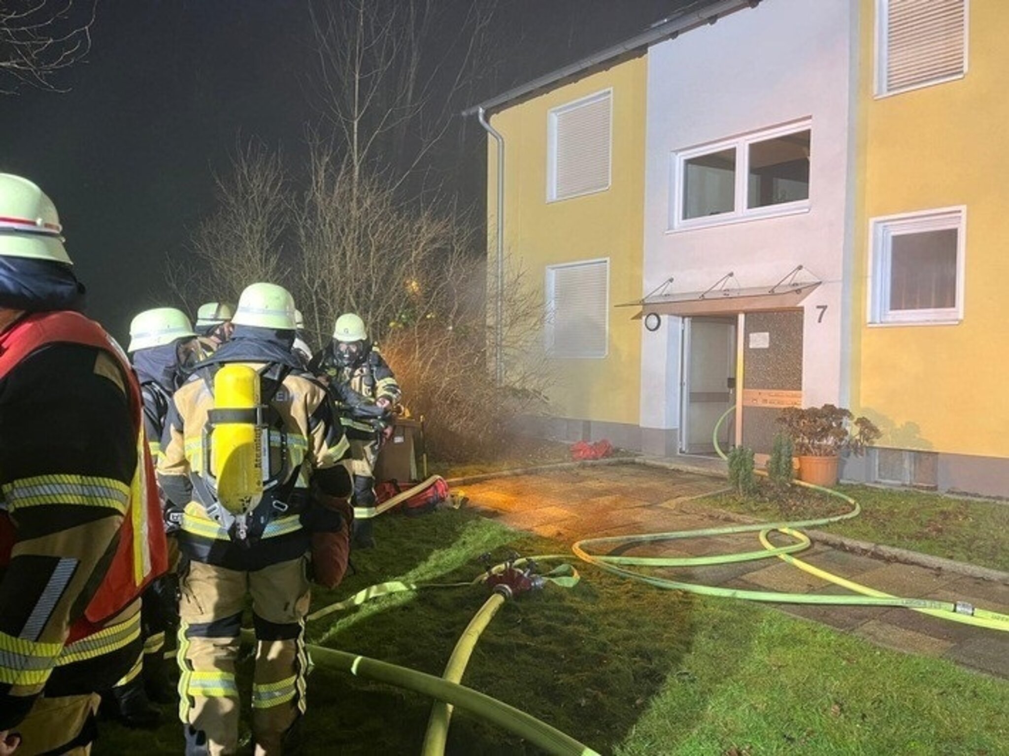 Nach einer ersten Erkundung wurden parallel das Gebäude auf Personen kontrolliert, eine Brandbekämpfung von einem Trupp unter Atemschutz eingeleitet und die leichtverletzte Person medizinisch vom Rettungsdienst versorgt. Glücklicherweise waren die anderen Anwohnerinnen und Anwohner nicht mehr in den Wohnungen, so dass die Einsatzkräfte den Fokus auf die Brandbekämpfung legen konnten. Da das Brandereignis auf einen Kellerraum beschränkt war, konnte dieser mit einem handgeführten Strahlrohr sehr schnell unter Kontrolle gebracht werden. Anschließend wurden umfangreiche Lüftungsmaßnahmen eingeleitet und in allen Wohneinheiten Kontrollmessungen auf Atemgifte durchgeführt.