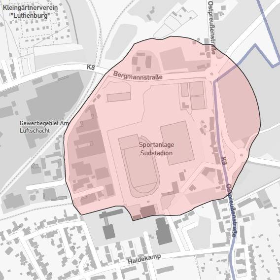 Anwohner müssen das Gebiet rund um das Südstadion in einem Radius von 250 Metern (siehe Karte) bis 16 Uhr verlassen. Laut der Stadt Gelsenlirchen sind aber nur wenige Anwohner betroffen. Deshalb wird auch keine Sammelstelle eingerichtet.