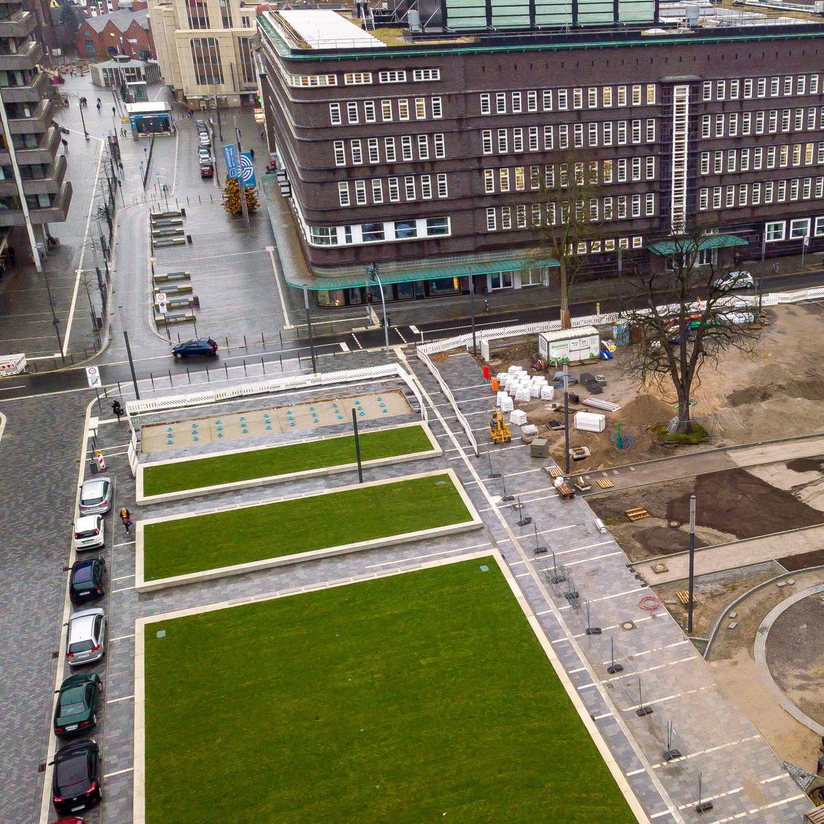Im Laufen letzte Arbeiten an den Park- und Spielflächen zwischen Musiktheater und Hans-Sachs-Haus.