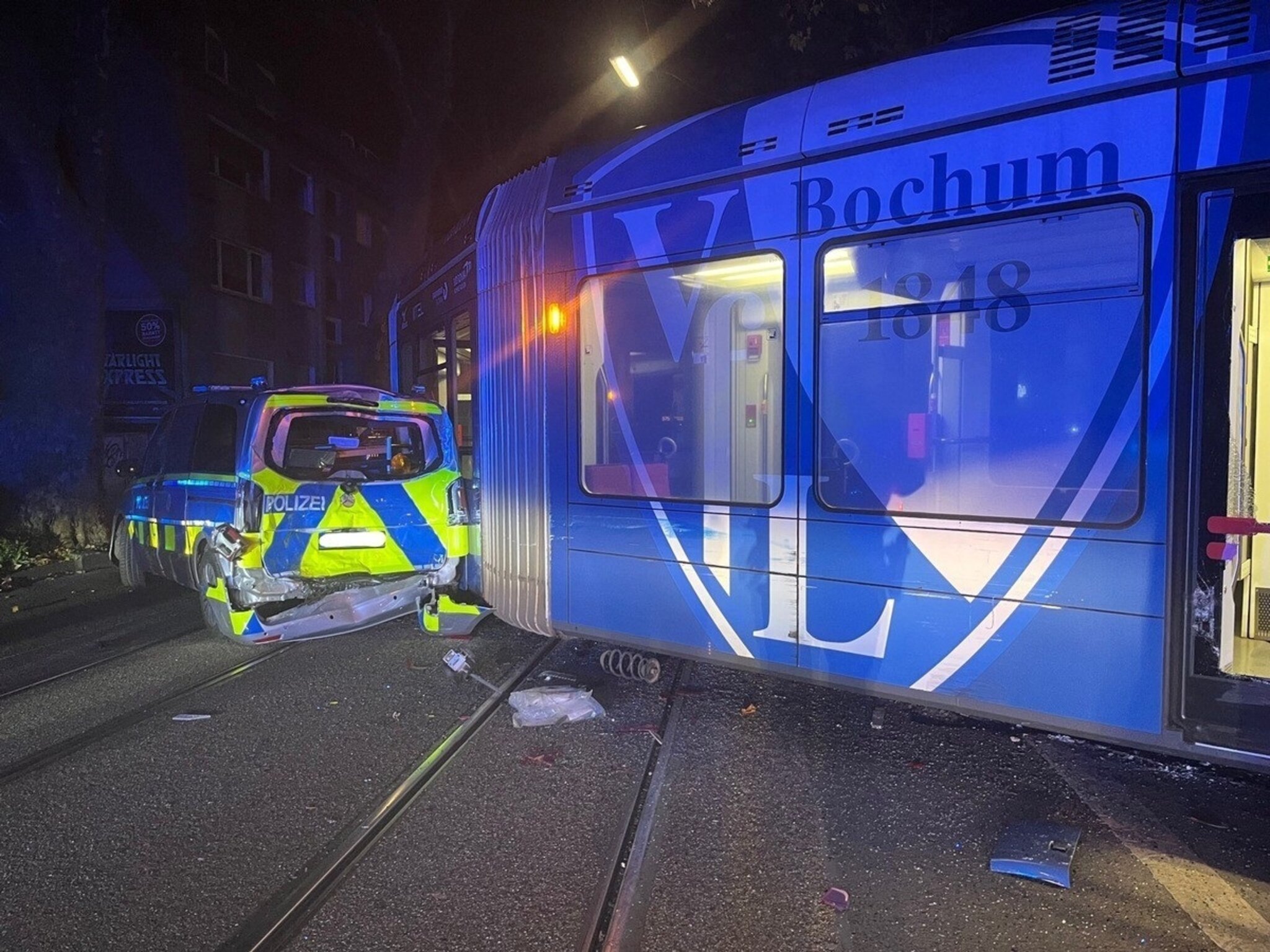 Witten. Am heutigen Samstag, 26.Oktober. 2024, gegen 05:43 Uhr, musste ein Streifenwagen der Polizei Witten einsatzbedingt im Bereich Crengeldanzstr./ Jahnstr. halten. Der Streifenwagen stand dabei teilweise auf den dort verlaufenden Schienen der Straßenbahn. Die Polizeibeamten führten außerhalb des Streifenwagens eine Personenkontrolle durch. Zur selben Zeit befuhr die Straßenbahn der Linie 310 (Fahrtrichtung Witten-Heven-Dorf) die Crengeldanzstr. Zu diesem Zeitpunkt waren ca. 15 Personen in der Bahn. Die Bahn kollidierte im weiteren Verlauf mit dem Streifenwagen und sprang aus den Schienen. Durch den Aufprall wurden weiterhin zwei geparkte Pkw, ein Verkehrszeichen, ein Baum und eine Hauswand beschädigt. Der Bahnfahrer (33-jähriger aus Bochum), ein Fahrgast (27-jähriger aus Bochum) und ein Fußgänger (20-jähriger aus Viernheim) wurden durch den Unfall leicht verletzt. Sie konnten allesamt nach Erstversorgung vor Ort entlassen werden. Aufgrund der umfangreichen Bergungsarbeiten bleibt die Unfallstelle noch längere Zeit gesperrt. Die weiteren Ermittlungen werden durch das hiesige Verkehrskommissariat geführt.
